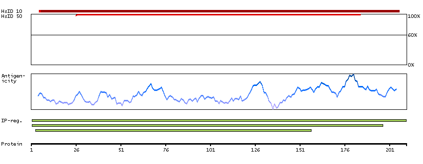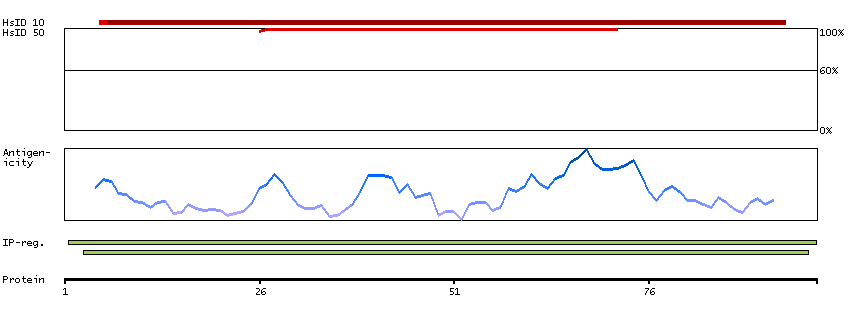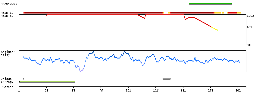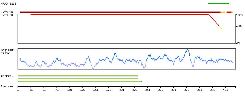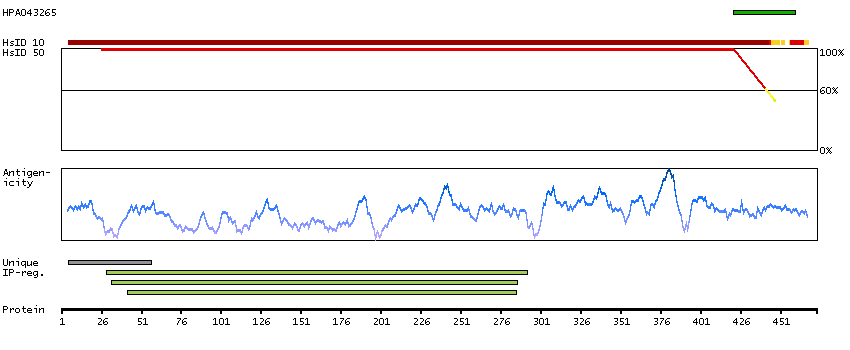 Under the antigens, the maximum percent sequence identity of the protein to all other proteins from other human genes is displayed, using a sliding window of 10 aa residues (HsID 10) or 50 aa residues (HsID 50). The region with the lowest possible identity is always selected for antigen design, with a maximum identity of 60% allowed for designing a single-target antigen (read more).
