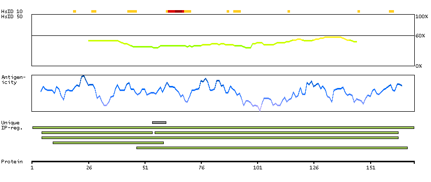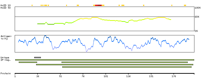 Under the antigens, the maximum percent sequence identity of the protein to all other proteins from other human genes is displayed, using a sliding window of 10 aa residues (HsID 10) or 50 aa residues (HsID 50). The region with the lowest possible identity is always selected for antigen design, with a maximum identity of 60% allowed for designing a single-target antigen (read more).