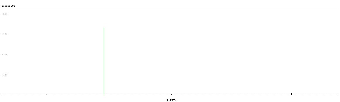At the top of the view, the position of the antigen (identified by the corresponding HPA identifier) is shown as a green bar. A yellow triangle on the bar indicates a <100% sequence identity to the protein target.