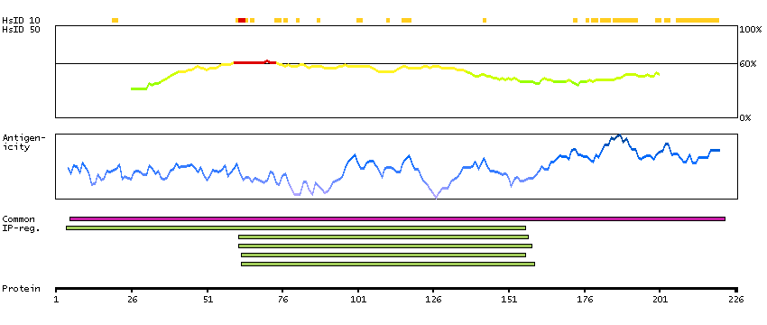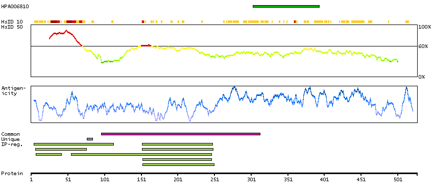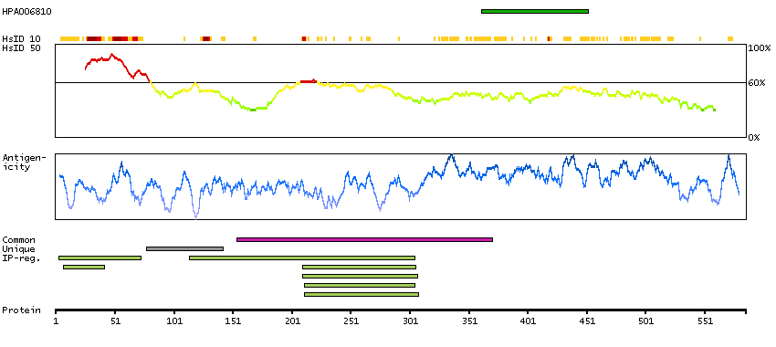 Under the antigens, the maximum percent sequence identity of the protein to all other proteins from other human genes is displayed, using a sliding window of 10 aa residues (HsID 10) or 50 aa residues (HsID 50). The region with the lowest possible identity is always selected for antigen design, with a maximum identity of 60% allowed for designing a single-target antigen (read more).