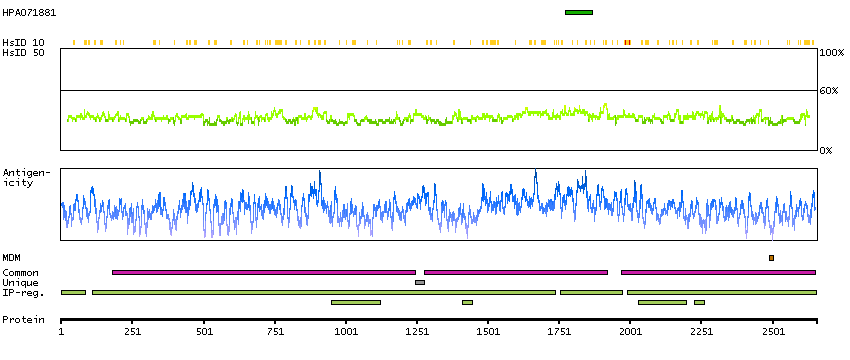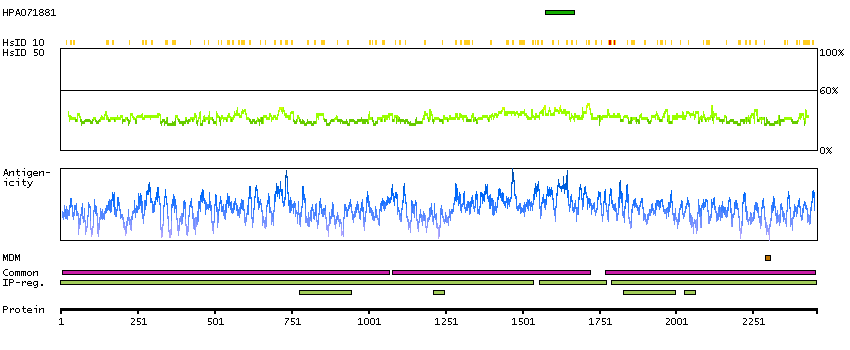 Under the antigens, the maximum percent sequence identity of the protein to all other proteins from other human genes is displayed, using a sliding window of 10 aa residues (HsID 10) or 50 aa residues (HsID 50). The region with the lowest possible identity is always selected for antigen design, with a maximum identity of 60% allowed for designing a single-target antigen (read more).