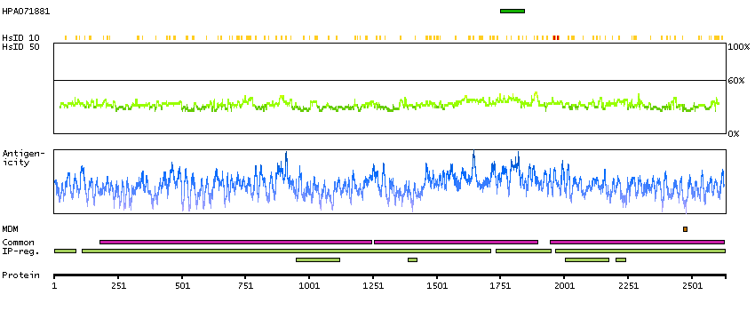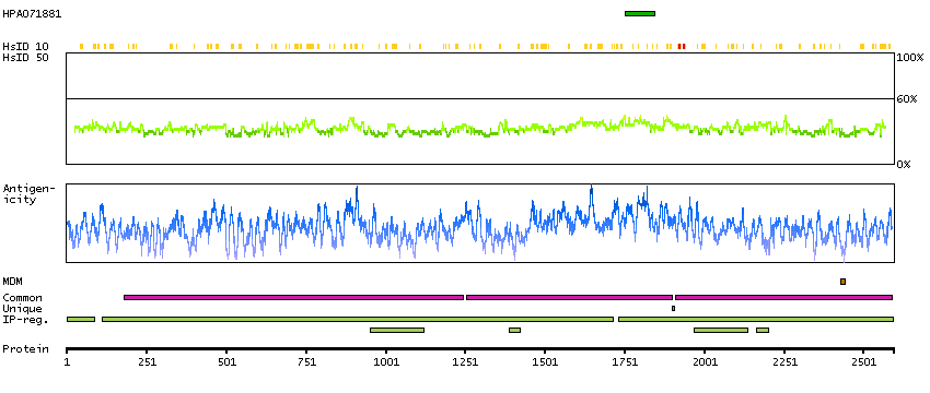 At the top of the view, the position of the antigen (identified by the corresponding HPA identifier) is shown as a green bar. A yellow triangle on the bar indicates a <100% sequence identity to the protein target.