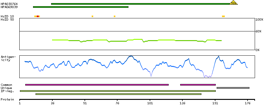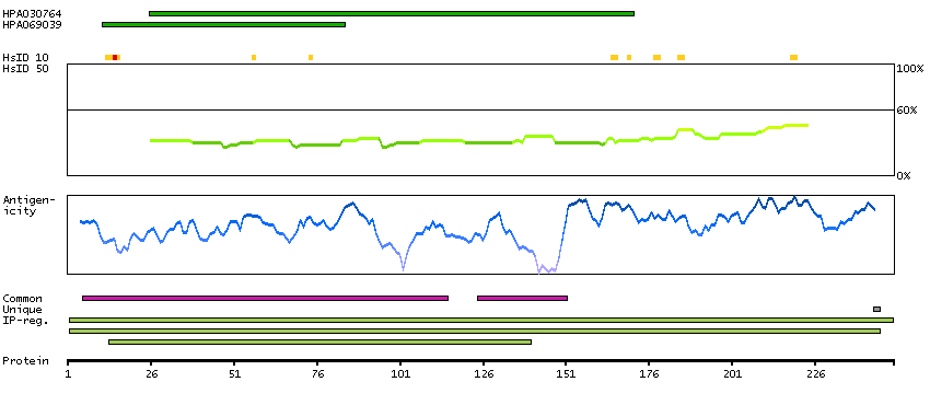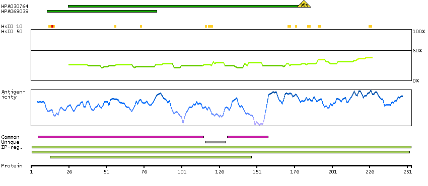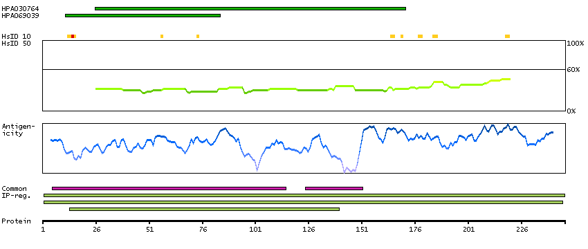 Under the antigens, the maximum percent sequence identity of the protein to all other proteins from other human genes is displayed, using a sliding window of 10 aa residues (HsID 10) or 50 aa residues (HsID 50). The region with the lowest possible identity is always selected for antigen design, with a maximum identity of 60% allowed for designing a single-target antigen (read more).