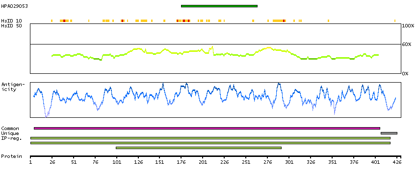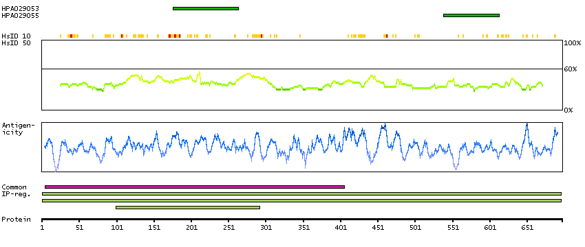 Under the antigens, the maximum percent sequence identity of the protein to all other proteins from other human genes is displayed, using a sliding window of 10 aa residues (HsID 10) or 50 aa residues (HsID 50). The region with the lowest possible identity is always selected for antigen design, with a maximum identity of 60% allowed for designing a single-target antigen (read more).