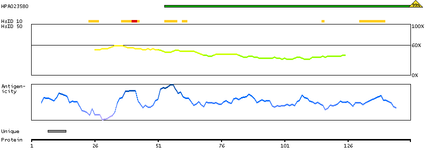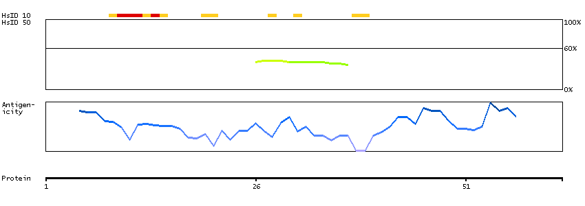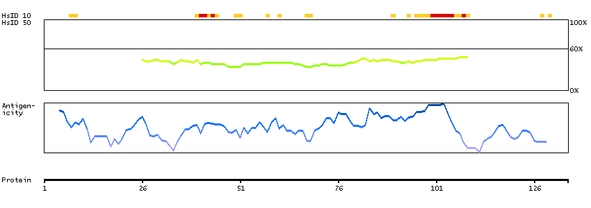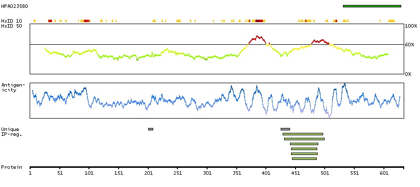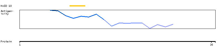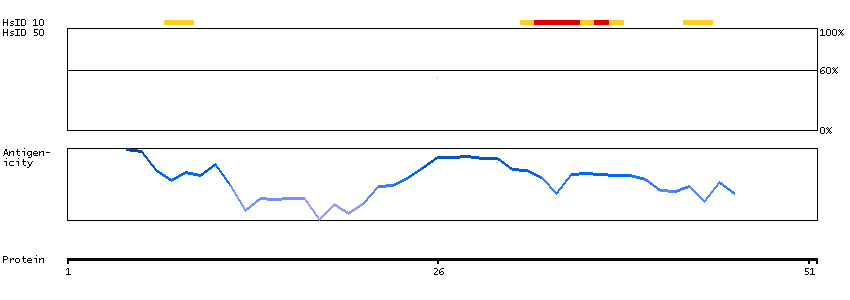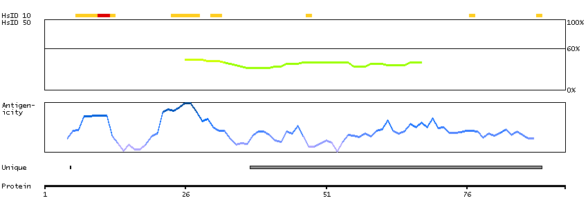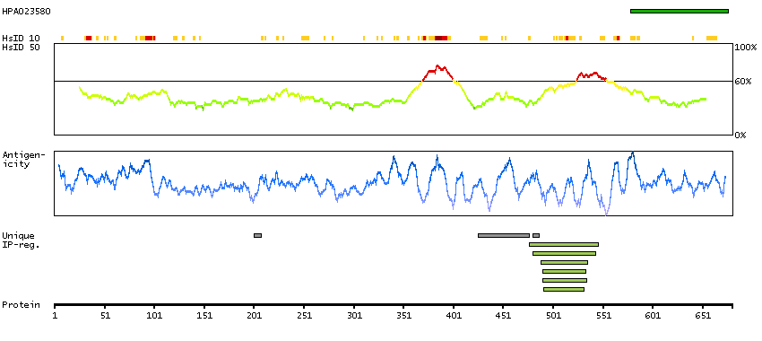 Under the antigens, the maximum percent sequence identity of the protein to all other proteins from other human genes is displayed, using a sliding window of 10 aa residues (HsID 10) or 50 aa residues (HsID 50). The region with the lowest possible identity is always selected for antigen design, with a maximum identity of 60% allowed for designing a single-target antigen (read more).