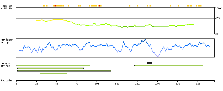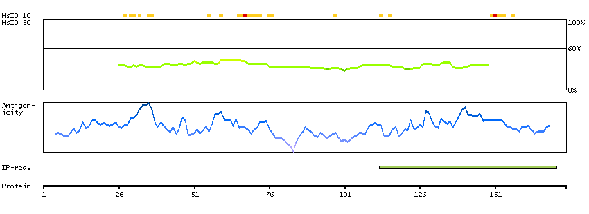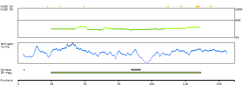 Under the antigens, the maximum percent sequence identity of the protein to all other proteins from other human genes is displayed, using a sliding window of 10 aa residues (HsID 10) or 50 aa residues (HsID 50). The region with the lowest possible identity is always selected for antigen design, with a maximum identity of 60% allowed for designing a single-target antigen (read more).