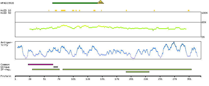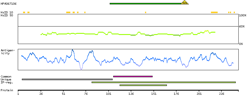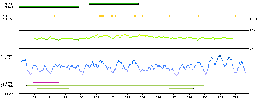 Under the antigens, the maximum percent sequence identity of the protein to all other proteins from other human genes is displayed, using a sliding window of 10 aa residues (HsID 10) or 50 aa residues (HsID 50). The region with the lowest possible identity is always selected for antigen design, with a maximum identity of 60% allowed for designing a single-target antigen (read more).