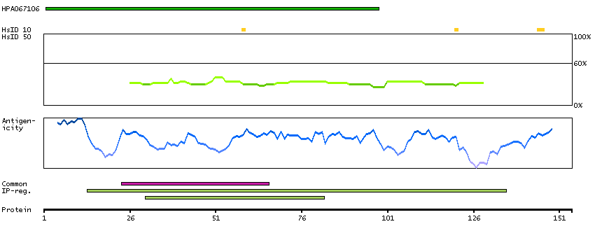 At the top of the view, the position of the antigen (identified by the corresponding HPA identifier) is shown as a green bar. A yellow triangle on the bar indicates a <100% sequence identity to the protein target.