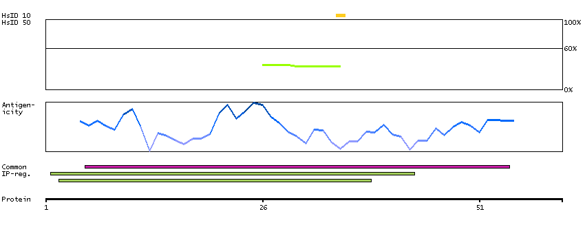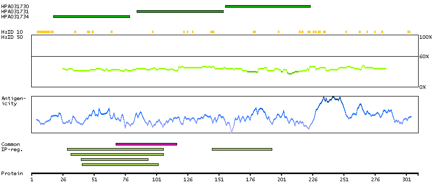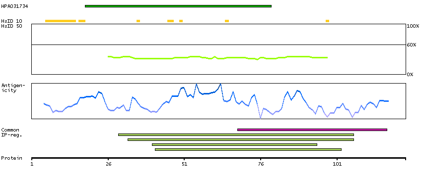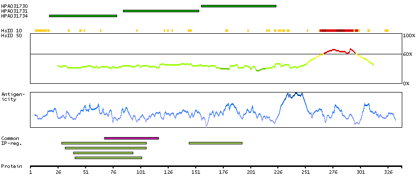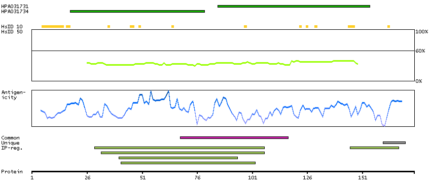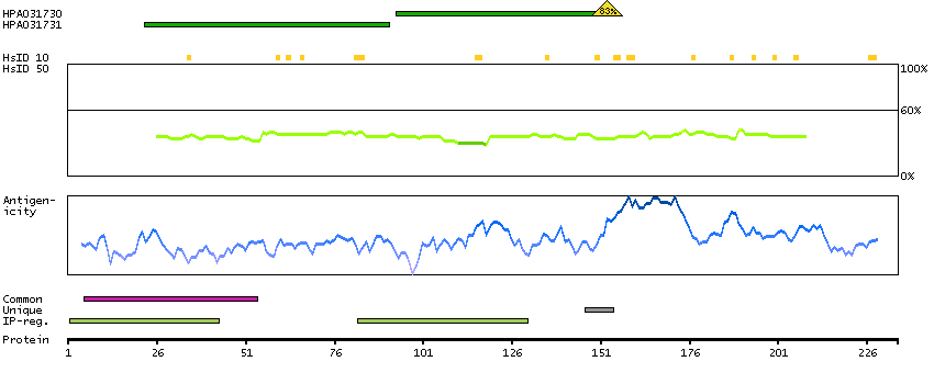 Under the antigens, the maximum percent sequence identity of the protein to all other proteins from other human genes is displayed, using a sliding window of 10 aa residues (HsID 10) or 50 aa residues (HsID 50). The region with the lowest possible identity is always selected for antigen design, with a maximum identity of 60% allowed for designing a single-target antigen (read more).