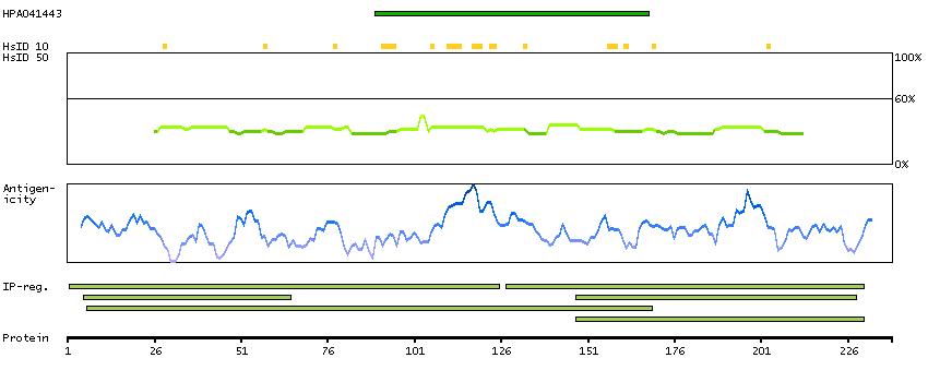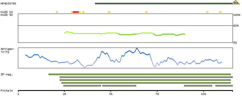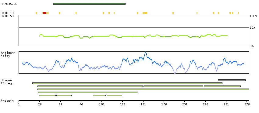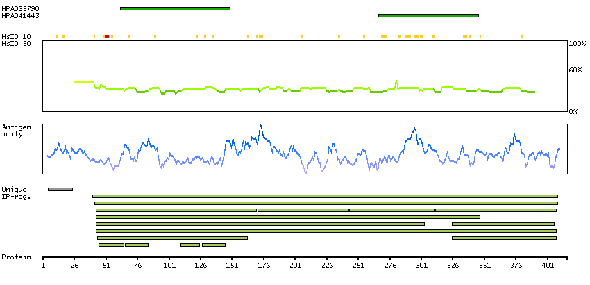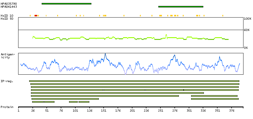 Under the antigens, the maximum percent sequence identity of the protein to all other proteins from other human genes is displayed, using a sliding window of 10 aa residues (HsID 10) or 50 aa residues (HsID 50). The region with the lowest possible identity is always selected for antigen design, with a maximum identity of 60% allowed for designing a single-target antigen (read more).