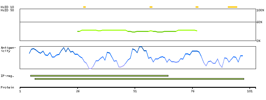 The curve in blue displays the predicted antigenicity i.e. the tendency for different regions of the protein to generate an immune response, with peak regions being predicted to be more antigenic.The curve shows average values based on a sliding window approach using an in-house propensity scale. (read more).