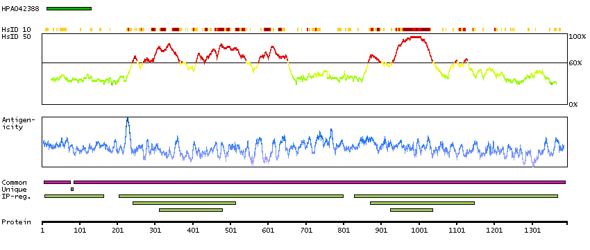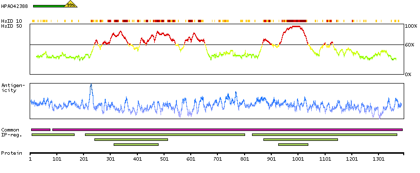 Under the antigens, the maximum percent sequence identity of the protein to all other proteins from other human genes is displayed, using a sliding window of 10 aa residues (HsID 10) or 50 aa residues (HsID 50). The region with the lowest possible identity is always selected for antigen design, with a maximum identity of 60% allowed for designing a single-target antigen (read more).