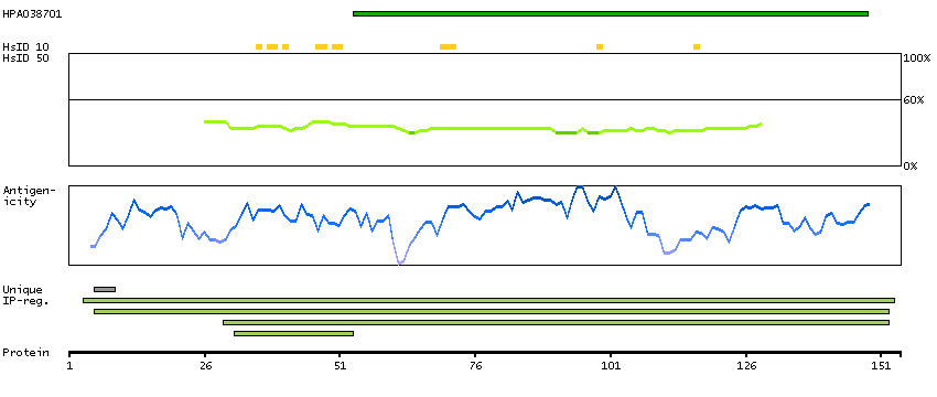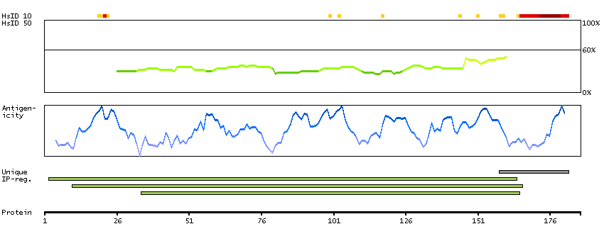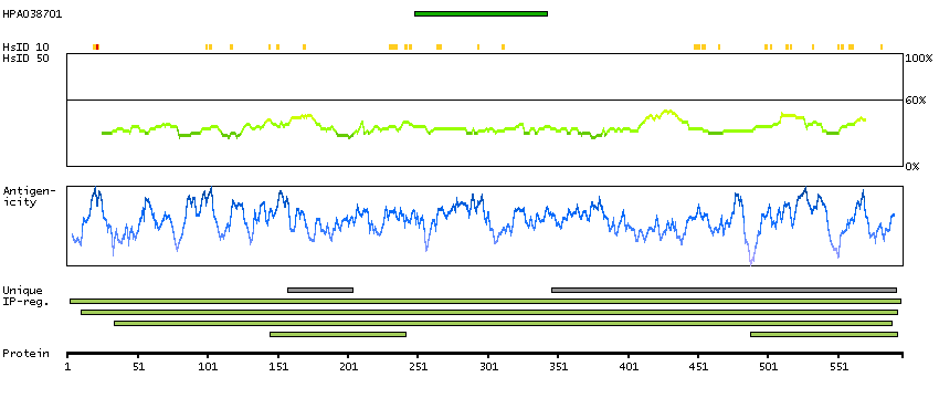 Under the antigens, the maximum percent sequence identity of the protein to all other proteins from other human genes is displayed, using a sliding window of 10 aa residues (HsID 10) or 50 aa residues (HsID 50). The region with the lowest possible identity is always selected for antigen design, with a maximum identity of 60% allowed for designing a single-target antigen (read more).