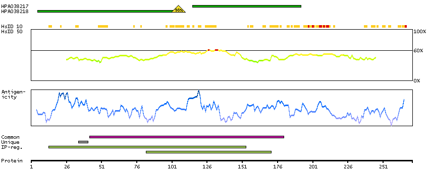 Under the antigens, the maximum percent sequence identity of the protein to all other proteins from other human genes is displayed, using a sliding window of 10 aa residues (HsID 10) or 50 aa residues (HsID 50). The region with the lowest possible identity is always selected for antigen design, with a maximum identity of 60% allowed for designing a single-target antigen (read more).