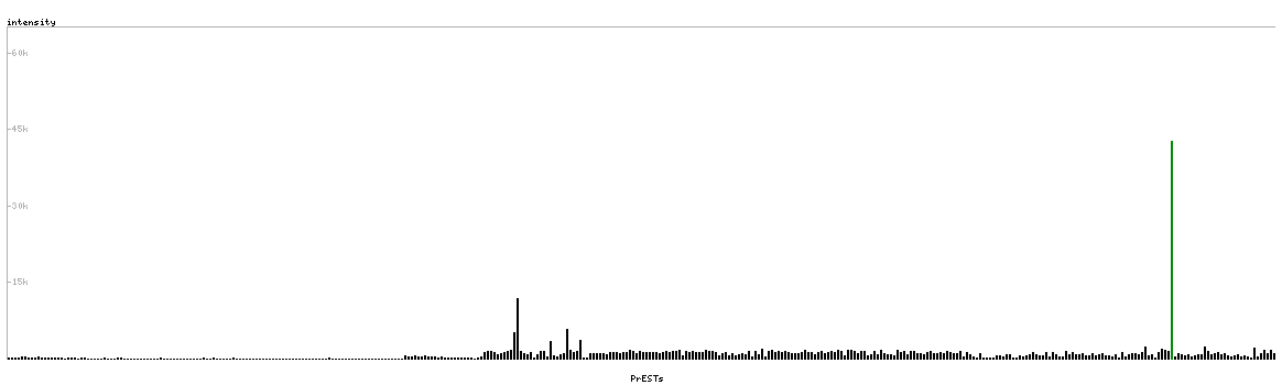 At the top of the view, the position of the antigen (identified by the corresponding HPA identifier) is shown as a green bar. A yellow triangle on the bar indicates a <100% sequence identity to the protein target.