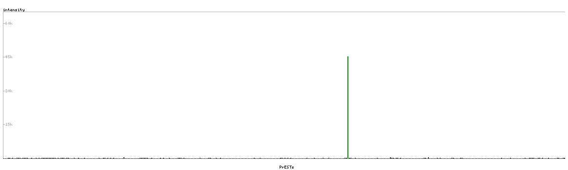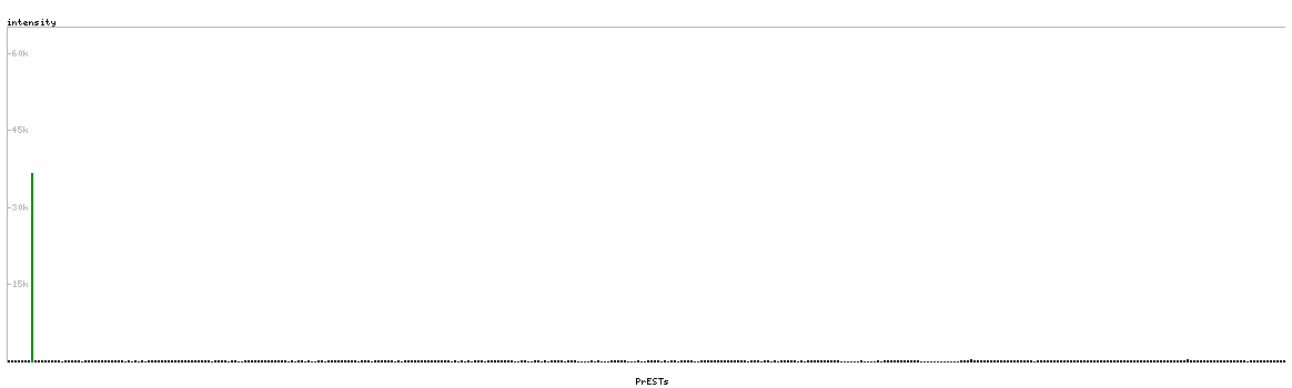 At the top of the view, the position of the antigen (identified by the corresponding HPA identifier) is shown as a green bar. A yellow triangle on the bar indicates a <100% sequence identity to the protein target.