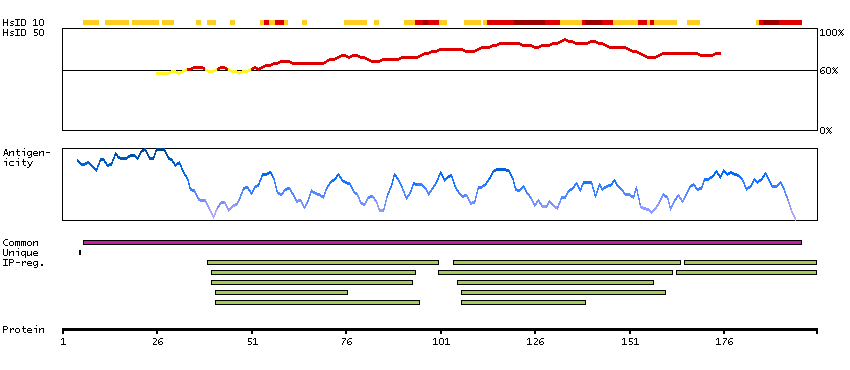 Under the antigens, the maximum percent sequence identity of the protein to all other proteins from other human genes is displayed, using a sliding window of 10 aa residues (HsID 10) or 50 aa residues (HsID 50). The region with the lowest possible identity is always selected for antigen design, with a maximum identity of 60% allowed for designing a single-target antigen (read more).
