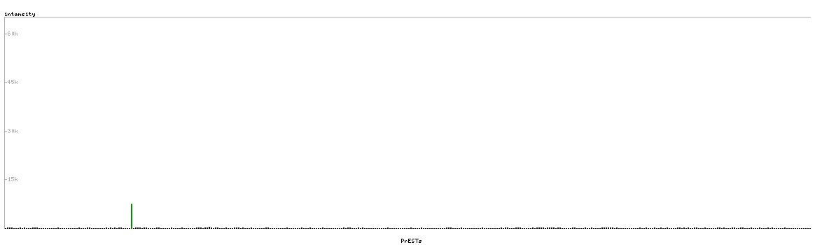 At the top of the view, the position of the antigen (identified by the corresponding HPA identifier) is shown as a green bar. A yellow triangle on the bar indicates a <100% sequence identity to the protein target.