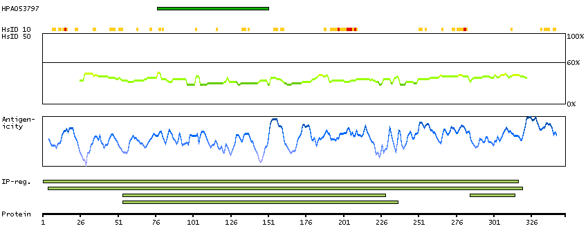 Under the antigens, the maximum percent sequence identity of the protein to all other proteins from other human genes is displayed, using a sliding window of 10 aa residues (HsID 10) or 50 aa residues (HsID 50). The region with the lowest possible identity is always selected for antigen design, with a maximum identity of 60% allowed for designing a single-target antigen (read more).