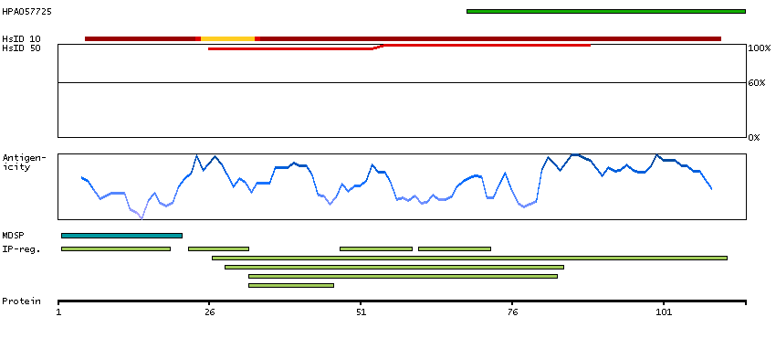 Under the antigens, the maximum percent sequence identity of the protein to all other proteins from other human genes is displayed, using a sliding window of 10 aa residues (HsID 10) or 50 aa residues (HsID 50). The region with the lowest possible identity is always selected for antigen design, with a maximum identity of 60% allowed for designing a single-target antigen (read more).