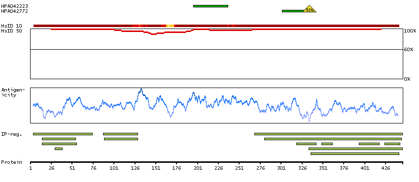 Under the antigens, the maximum percent sequence identity of the protein to all other proteins from other human genes is displayed, using a sliding window of 10 aa residues (HsID 10) or 50 aa residues (HsID 50). The region with the lowest possible identity is always selected for antigen design, with a maximum identity of 60% allowed for designing a single-target antigen (read more).