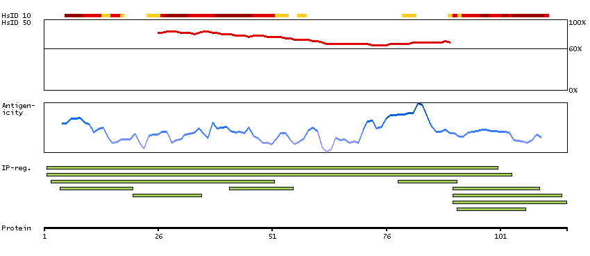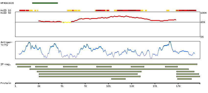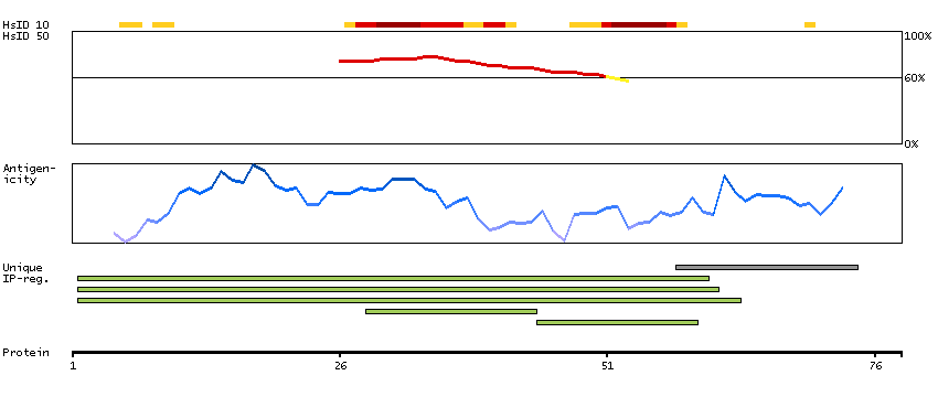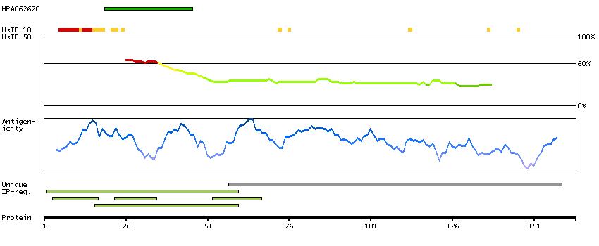 Under the antigens, the maximum percent sequence identity of the protein to all other proteins from other human genes is displayed, using a sliding window of 10 aa residues (HsID 10) or 50 aa residues (HsID 50). The region with the lowest possible identity is always selected for antigen design, with a maximum identity of 60% allowed for designing a single-target antigen (read more).