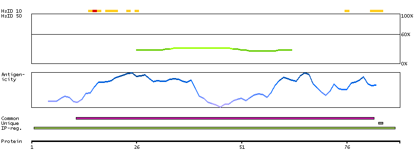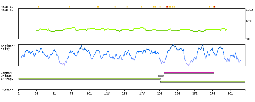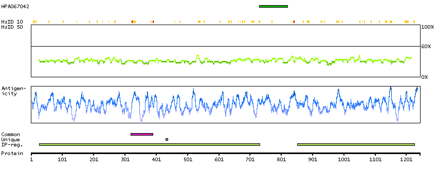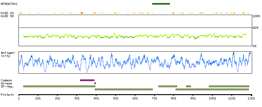 Under the antigens, the maximum percent sequence identity of the protein to all other proteins from other human genes is displayed, using a sliding window of 10 aa residues (HsID 10) or 50 aa residues (HsID 50). The region with the lowest possible identity is always selected for antigen design, with a maximum identity of 60% allowed for designing a single-target antigen (read more).