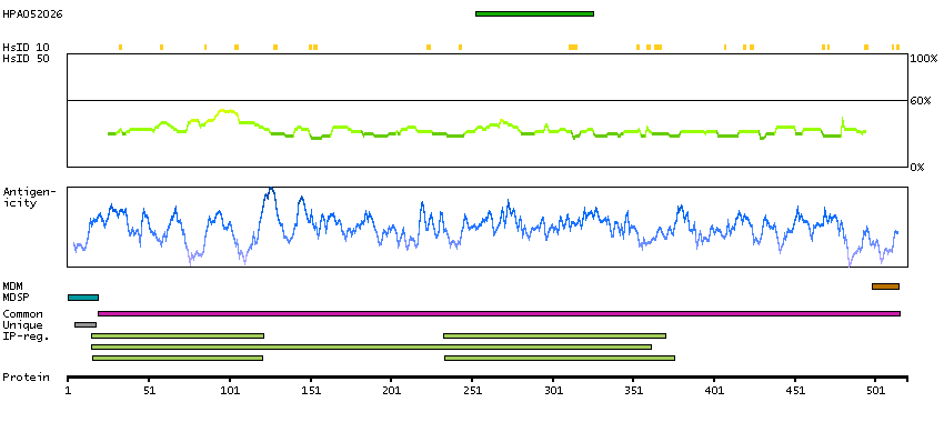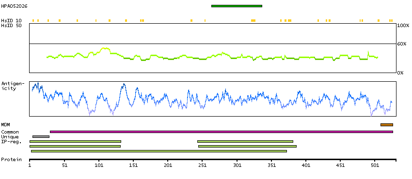 Under the antigens, the maximum percent sequence identity of the protein to all other proteins from other human genes is displayed, using a sliding window of 10 aa residues (HsID 10) or 50 aa residues (HsID 50). The region with the lowest possible identity is always selected for antigen design, with a maximum identity of 60% allowed for designing a single-target antigen (read more).