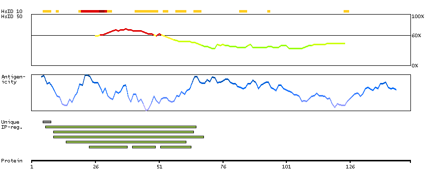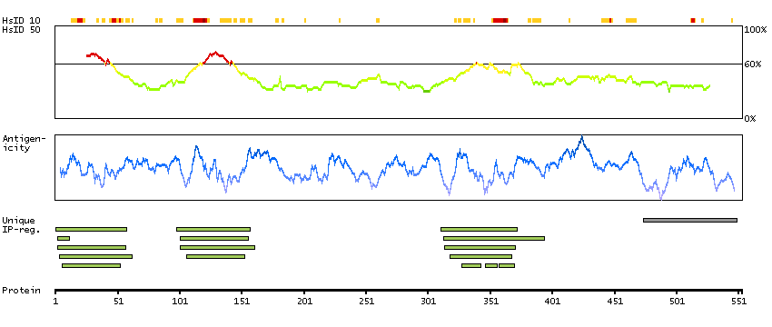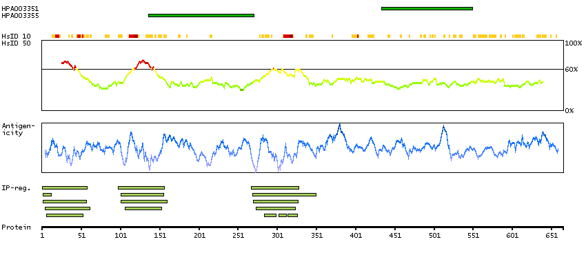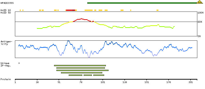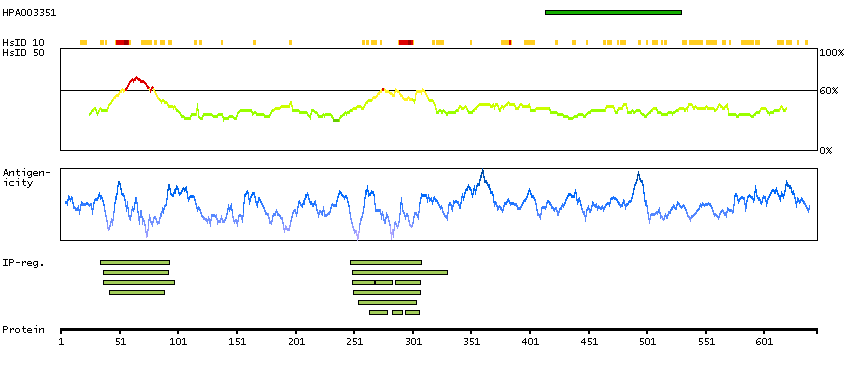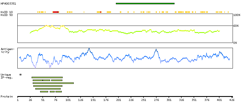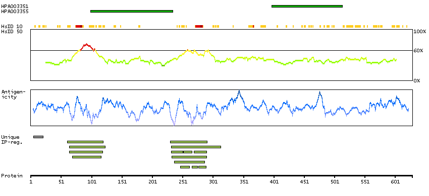 Under the antigens, the maximum percent sequence identity of the protein to all other proteins from other human genes is displayed, using a sliding window of 10 aa residues (HsID 10) or 50 aa residues (HsID 50). The region with the lowest possible identity is always selected for antigen design, with a maximum identity of 60% allowed for designing a single-target antigen (read more).