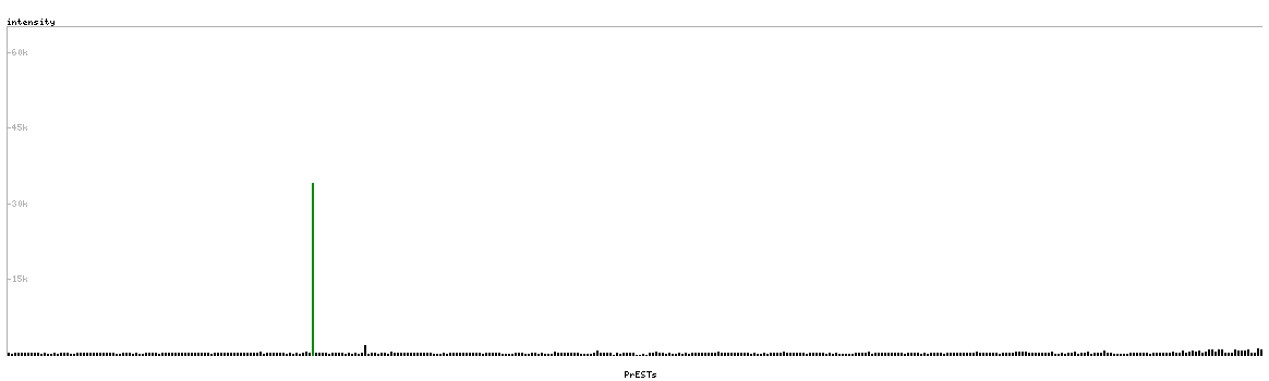 At the top of the view, the position of the antigen (identified by the corresponding HPA identifier) is shown as a green bar. A yellow triangle on the bar indicates a <100% sequence identity to the protein target.