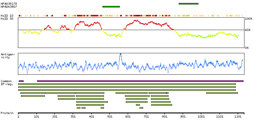 Under the antigens, the maximum percent sequence identity of the protein to all other proteins from other human genes is displayed, using a sliding window of 10 aa residues (HsID 10) or 50 aa residues (HsID 50). The region with the lowest possible identity is always selected for antigen design, with a maximum identity of 60% allowed for designing a single-target antigen (read more).