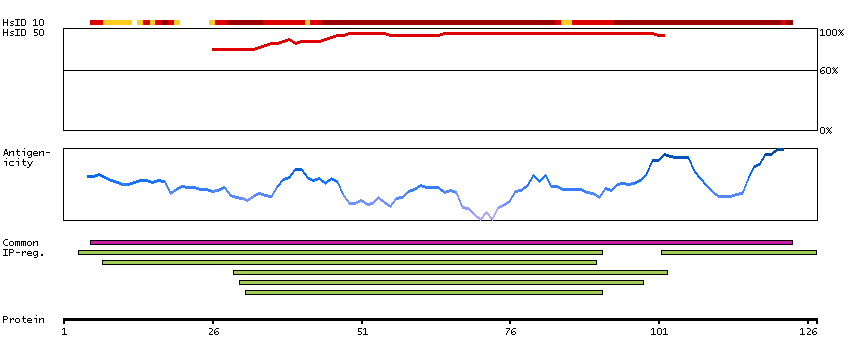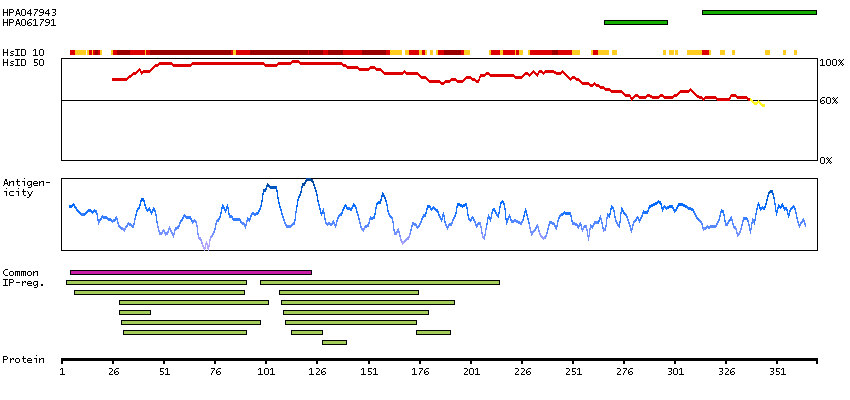 Under the antigens, the maximum percent sequence identity of the protein to all other proteins from other human genes is displayed, using a sliding window of 10 aa residues (HsID 10) or 50 aa residues (HsID 50). The region with the lowest possible identity is always selected for antigen design, with a maximum identity of 60% allowed for designing a single-target antigen (read more).
