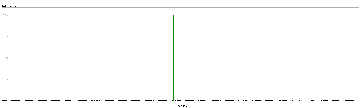 At the top of the view, the position of the antigen (identified by the corresponding HPA identifier) is shown as a green bar. A yellow triangle on the bar indicates a <100% sequence identity to the protein target.