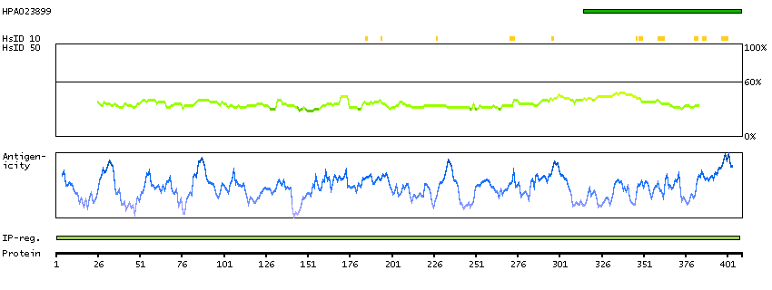 Under the antigens, the maximum percent sequence identity of the protein to all other proteins from other human genes is displayed, using a sliding window of 10 aa residues (HsID 10) or 50 aa residues (HsID 50). The region with the lowest possible identity is always selected for antigen design, with a maximum identity of 60% allowed for designing a single-target antigen (read more).