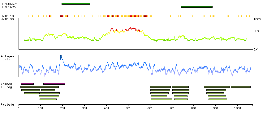 Under the antigens, the maximum percent sequence identity of the protein to all other proteins from other human genes is displayed, using a sliding window of 10 aa residues (HsID 10) or 50 aa residues (HsID 50). The region with the lowest possible identity is always selected for antigen design, with a maximum identity of 60% allowed for designing a single-target antigen (read more).