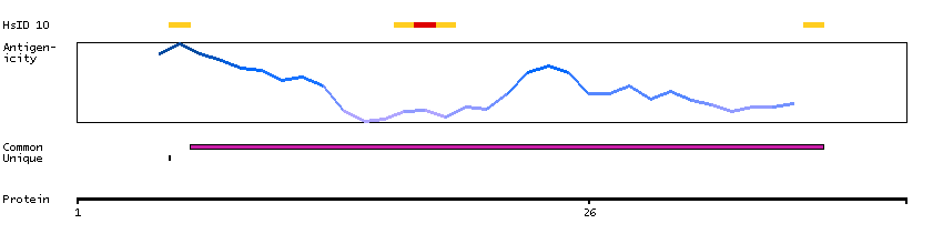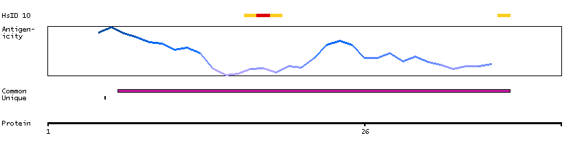 Under the antigens, the maximum percent sequence identity of the protein to all other proteins from other human genes is displayed, using a sliding window of 10 aa residues (HsID 10) or 50 aa residues (HsID 50). The region with the lowest possible identity is always selected for antigen design, with a maximum identity of 60% allowed for designing a single-target antigen (read more).