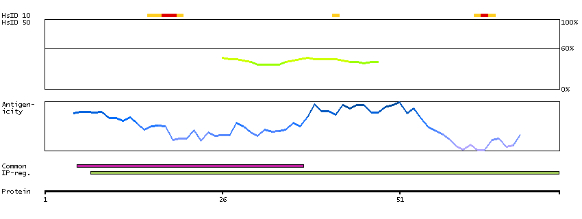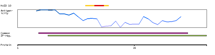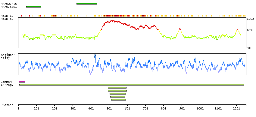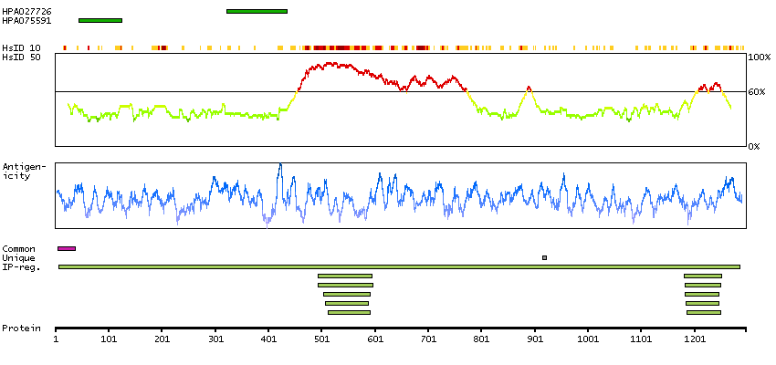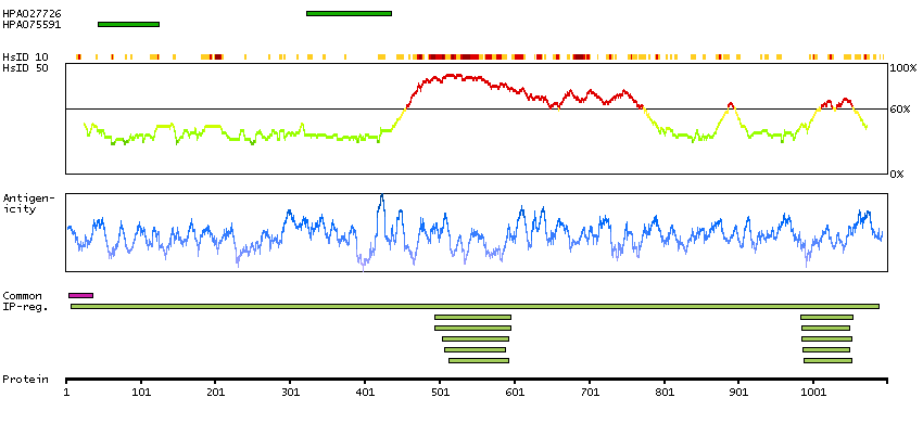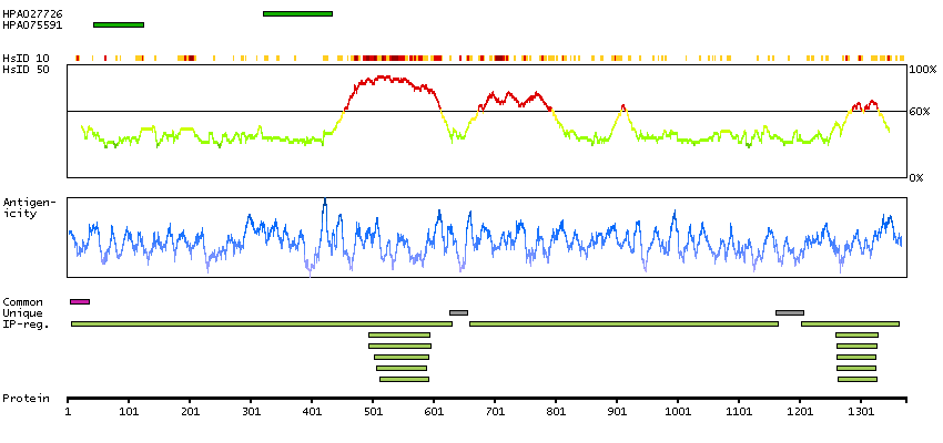 Under the antigens, the maximum percent sequence identity of the protein to all other proteins from other human genes is displayed, using a sliding window of 10 aa residues (HsID 10) or 50 aa residues (HsID 50). The region with the lowest possible identity is always selected for antigen design, with a maximum identity of 60% allowed for designing a single-target antigen (read more).