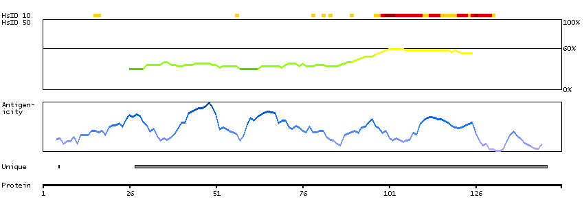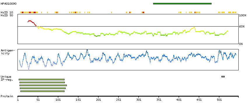 Under the antigens, the maximum percent sequence identity of the protein to all other proteins from other human genes is displayed, using a sliding window of 10 aa residues (HsID 10) or 50 aa residues (HsID 50). The region with the lowest possible identity is always selected for antigen design, with a maximum identity of 60% allowed for designing a single-target antigen (read more).