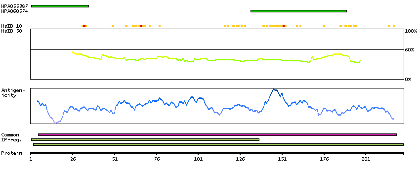 Under the antigens, the maximum percent sequence identity of the protein to all other proteins from other human genes is displayed, using a sliding window of 10 aa residues (HsID 10) or 50 aa residues (HsID 50). The region with the lowest possible identity is always selected for antigen design, with a maximum identity of 60% allowed for designing a single-target antigen (read more).