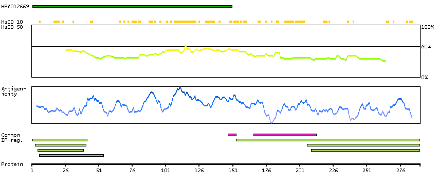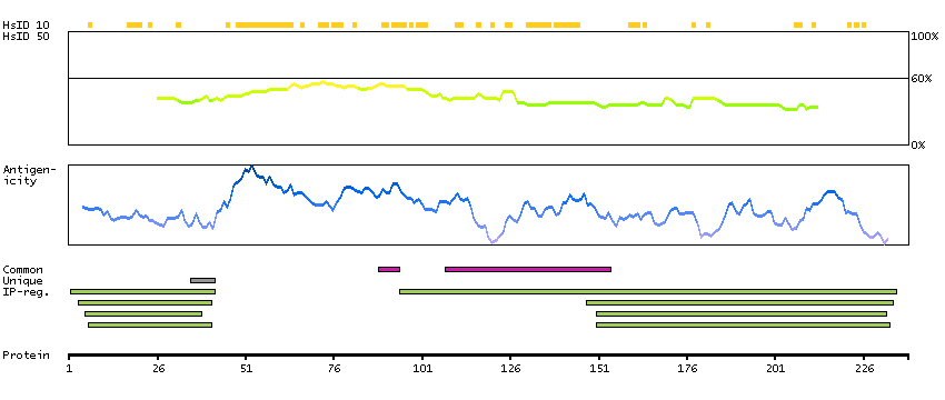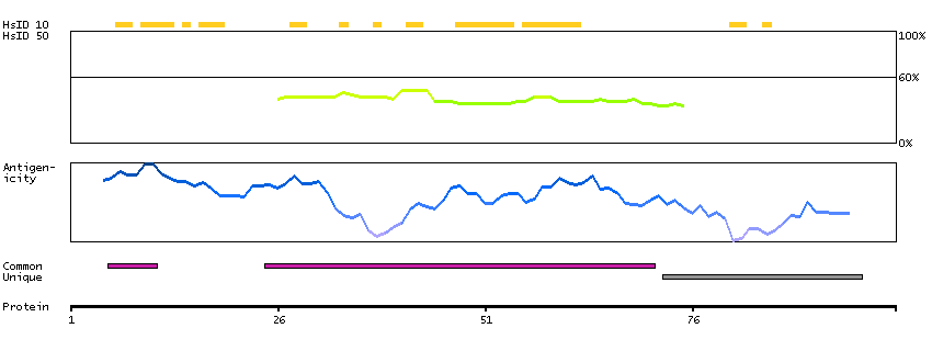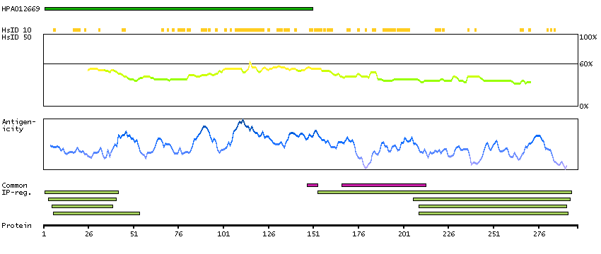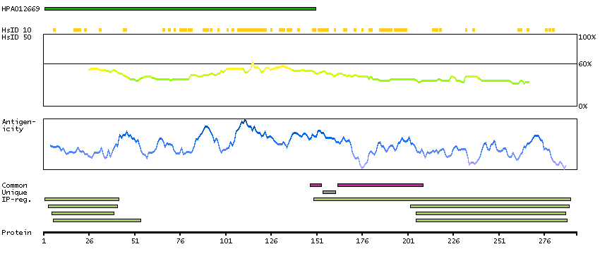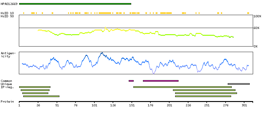 Under the antigens, the maximum percent sequence identity of the protein to all other proteins from other human genes is displayed, using a sliding window of 10 aa residues (HsID 10) or 50 aa residues (HsID 50). The region with the lowest possible identity is always selected for antigen design, with a maximum identity of 60% allowed for designing a single-target antigen (read more).