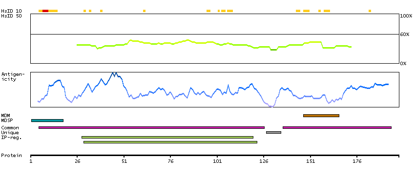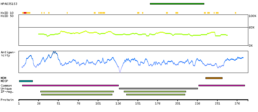 Under the antigens, the maximum percent sequence identity of the protein to all other proteins from other human genes is displayed, using a sliding window of 10 aa residues (HsID 10) or 50 aa residues (HsID 50). The region with the lowest possible identity is always selected for antigen design, with a maximum identity of 60% allowed for designing a single-target antigen (read more).