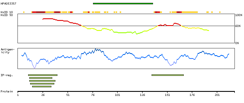 Under the antigens, the maximum percent sequence identity of the protein to all other proteins from other human genes is displayed, using a sliding window of 10 aa residues (HsID 10) or 50 aa residues (HsID 50). The region with the lowest possible identity is always selected for antigen design, with a maximum identity of 60% allowed for designing a single-target antigen (read more).