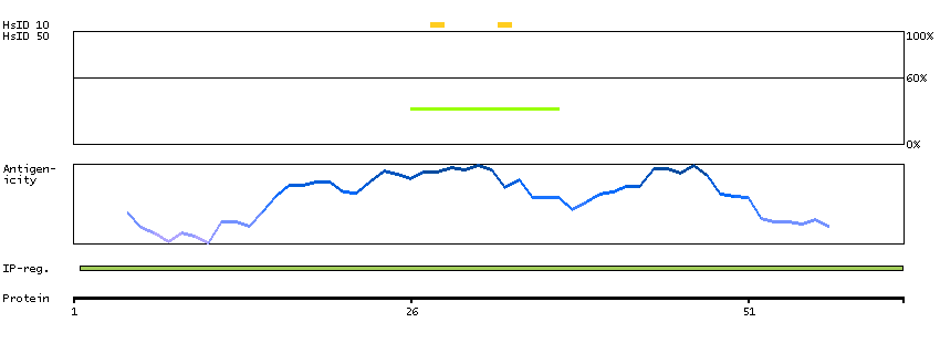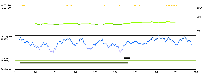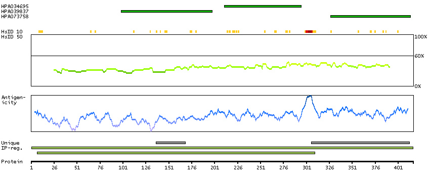 Under the antigens, the maximum percent sequence identity of the protein to all other proteins from other human genes is displayed, using a sliding window of 10 aa residues (HsID 10) or 50 aa residues (HsID 50). The region with the lowest possible identity is always selected for antigen design, with a maximum identity of 60% allowed for designing a single-target antigen (read more).
