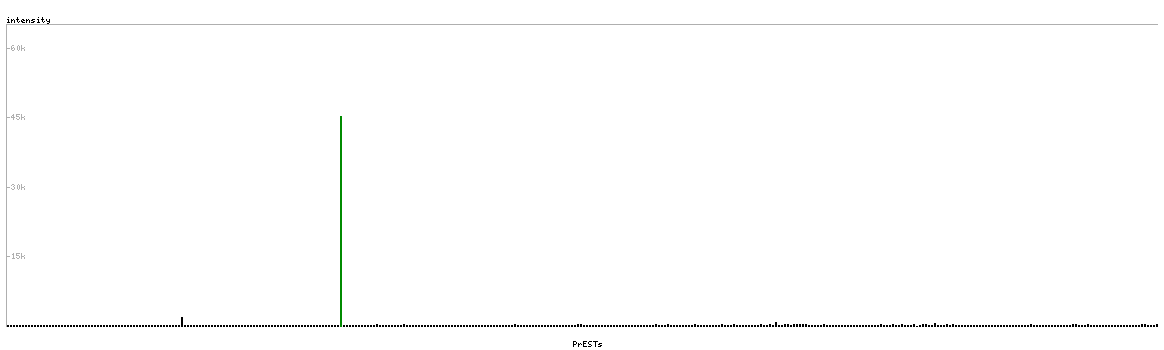At the top of the view, the position of the antigen (identified by the corresponding HPA identifier) is shown as a green bar. A yellow triangle on the bar indicates a <100% sequence identity to the protein target.