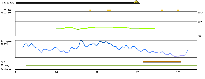 At the top of the view, the position of the antigen (identified by the corresponding HPA identifier) is shown as a green bar. A yellow triangle on the bar indicates a <100% sequence identity to the protein target.
