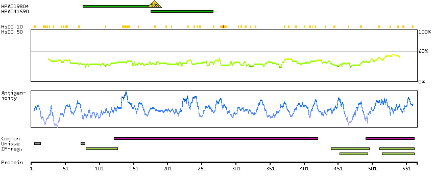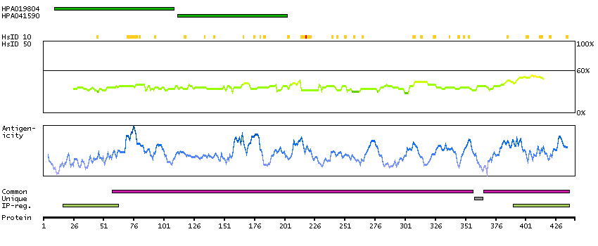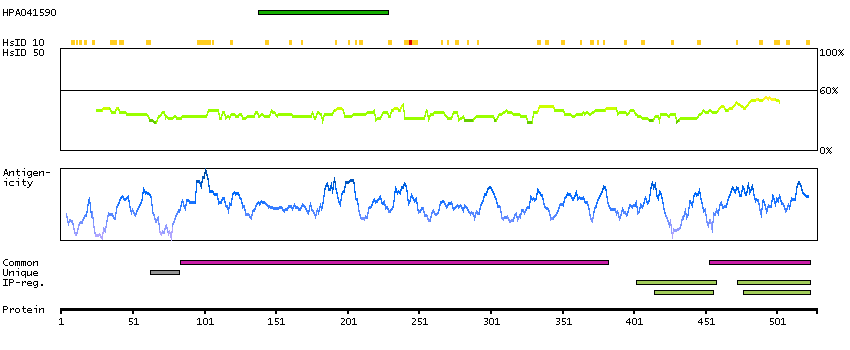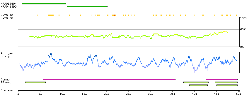 Under the antigens, the maximum percent sequence identity of the protein to all other proteins from other human genes is displayed, using a sliding window of 10 aa residues (HsID 10) or 50 aa residues (HsID 50). The region with the lowest possible identity is always selected for antigen design, with a maximum identity of 60% allowed for designing a single-target antigen (read more).