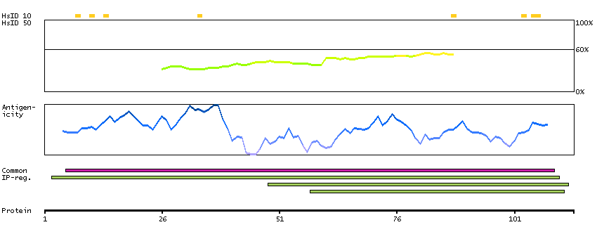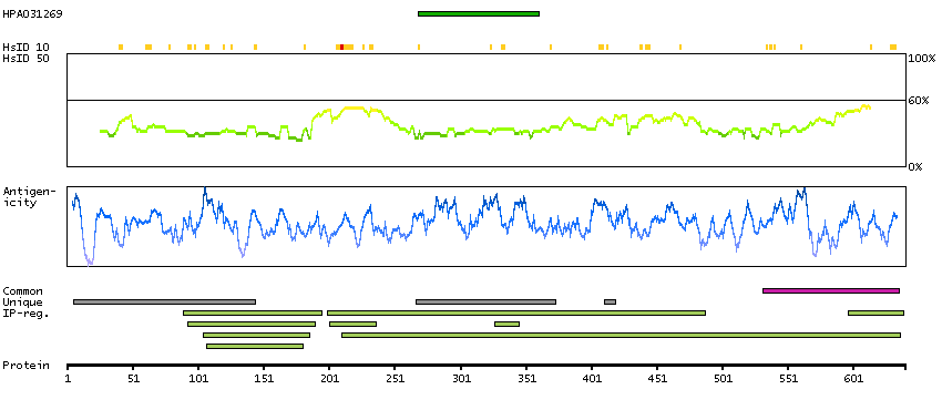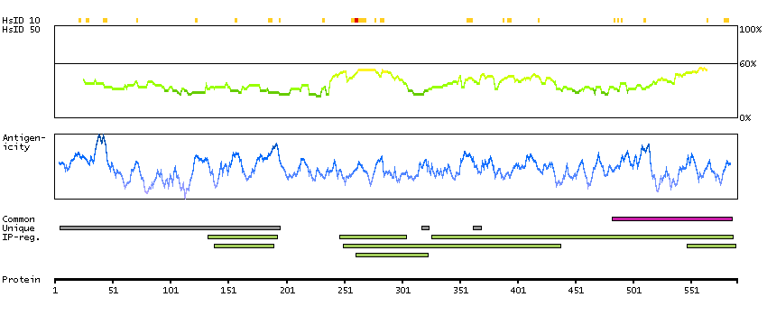 Under the antigens, the maximum percent sequence identity of the protein to all other proteins from other human genes is displayed, using a sliding window of 10 aa residues (HsID 10) or 50 aa residues (HsID 50). The region with the lowest possible identity is always selected for antigen design, with a maximum identity of 60% allowed for designing a single-target antigen (read more).