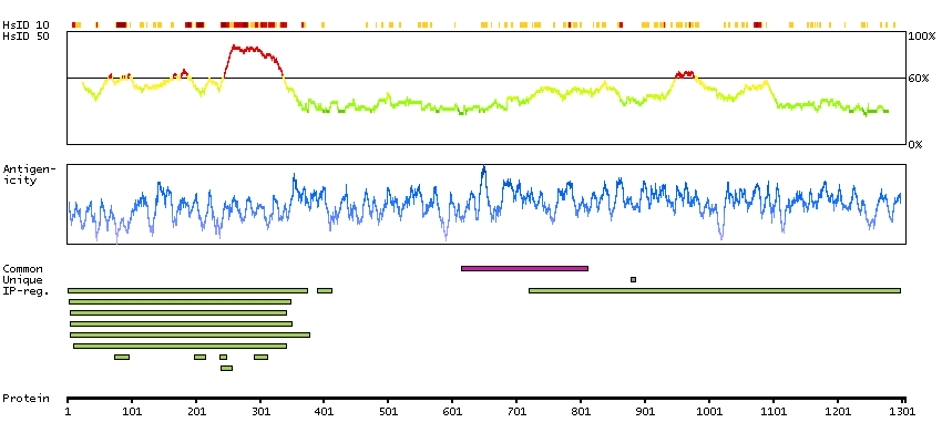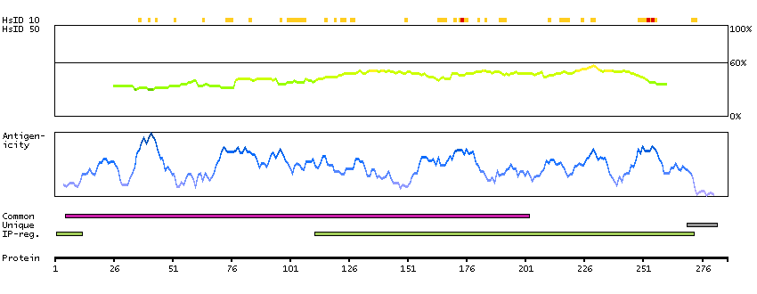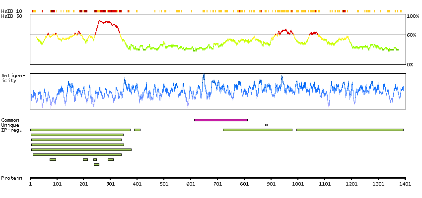 Under the antigens, the maximum percent sequence identity of the protein to all other proteins from other human genes is displayed, using a sliding window of 10 aa residues (HsID 10) or 50 aa residues (HsID 50). The region with the lowest possible identity is always selected for antigen design, with a maximum identity of 60% allowed for designing a single-target antigen (read more).