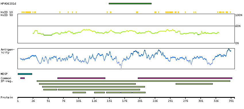 The curve in blue displays the predicted antigenicity i.e. the tendency for different regions of the protein to generate an immune response, with peak regions being predicted to be more antigenic.The curve shows average values based on a sliding window approach using an in-house propensity scale. (read more).