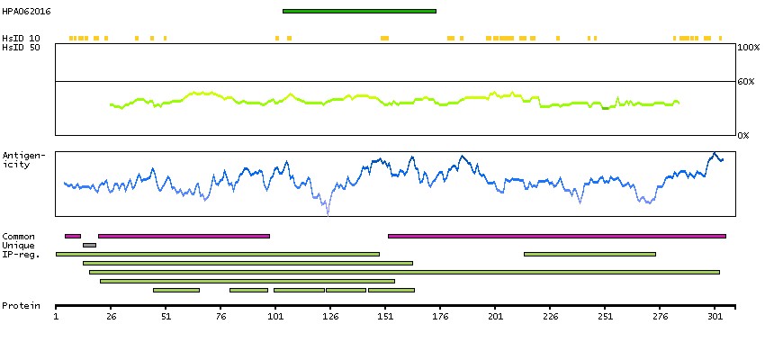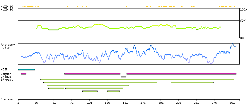 Under the antigens, the maximum percent sequence identity of the protein to all other proteins from other human genes is displayed, using a sliding window of 10 aa residues (HsID 10) or 50 aa residues (HsID 50). The region with the lowest possible identity is always selected for antigen design, with a maximum identity of 60% allowed for designing a single-target antigen (read more).